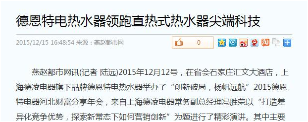 2015年12月12號,在省會石家莊匯文大酒店,上海德凌電器旗下品牌德恩特電熱水器舉辦了“創新破局,楊帆遠航”2015德恩特電器河北財富分享年會